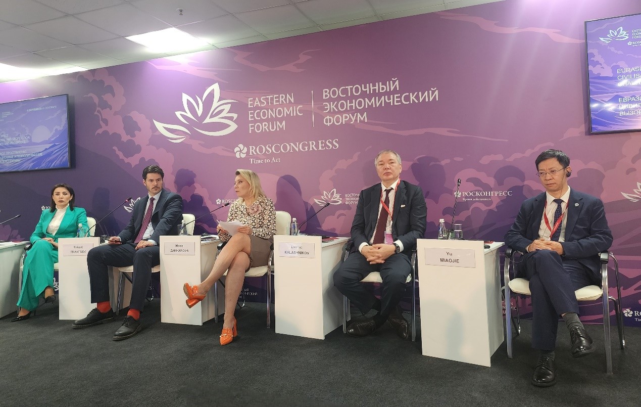 2024年9月6日,余淼杰校长应邀出席了分论坛“欧亚空间:文明与地缘政治的挑战与前景”。该论坛由全俄国家电视广播公司中亚局局长、《亚洲中心》节目主持人罗伯特・弗兰采夫主持。发言嘉宾还包括俄罗斯联邦外交部信息与出版司司长玛丽亚・扎哈罗娃,俄罗斯联邦国家杜马独联体事务、欧亚一体化和与同胞关系委员会主席列昂尼德・卡拉什尼科夫,欧亚经济委员会工业和农工综合体部长高哈尔・巴塞吉安,俄罗斯联邦经济发展部副部长德米特里・沃尔瓦奇。